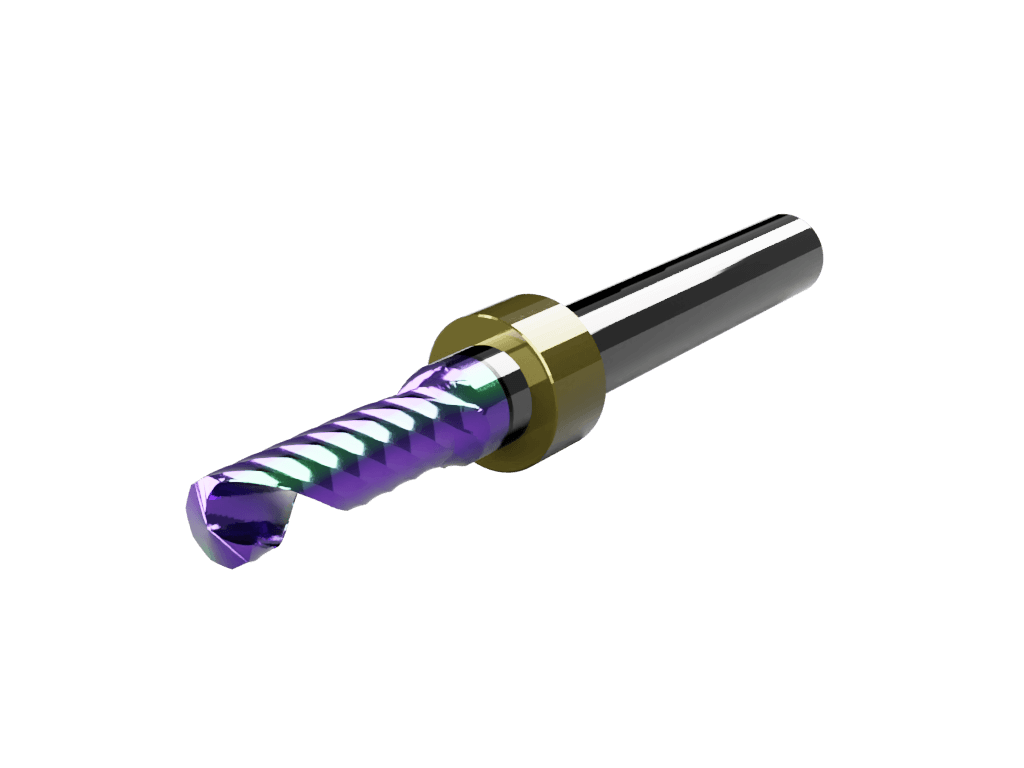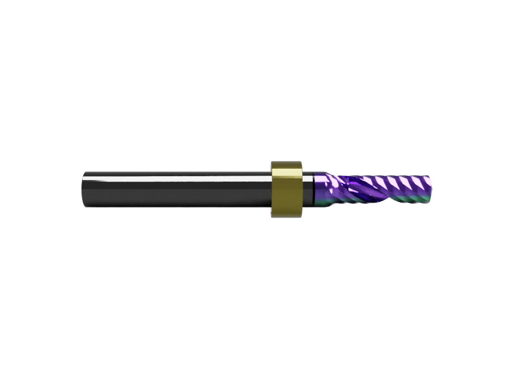 Multielement multilayered “rainbow” coated, “Super” carbide, polished, multi-purpose, single O-flute, left-hand spiral (up cut) router bit with a 5mm cutting edge diameter and max milling depth of 20mm. With stop ring (for use with the Zund ARC system and IECHO Tool Changer).
