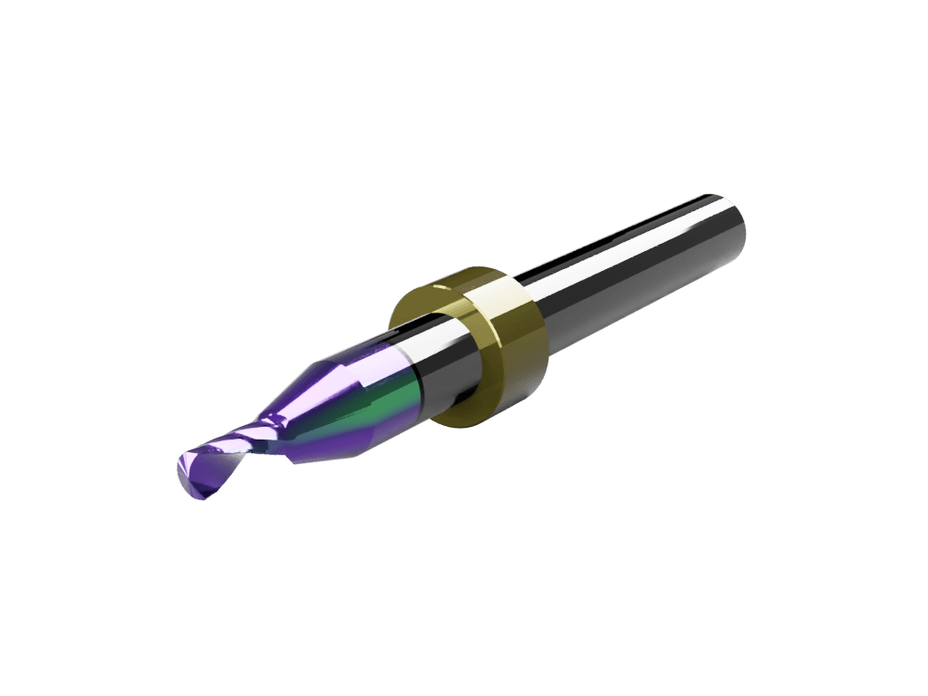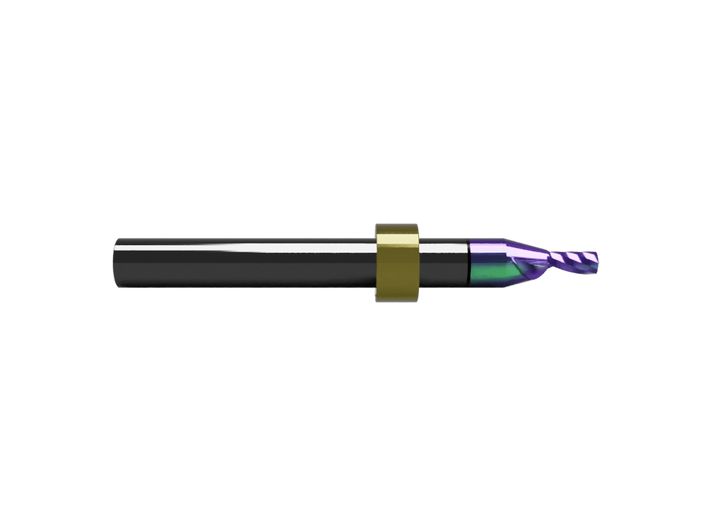 Multielement multilayered “rainbow” coated, “Super” carbide, multi-purpose, single O-flute, right-hand spiral (up cut) router bit with a 3mm cutting edge diameter and max milling depth of 8mm. With stop ring (for use with the Zund ARC system and IECHO Tool Changer).