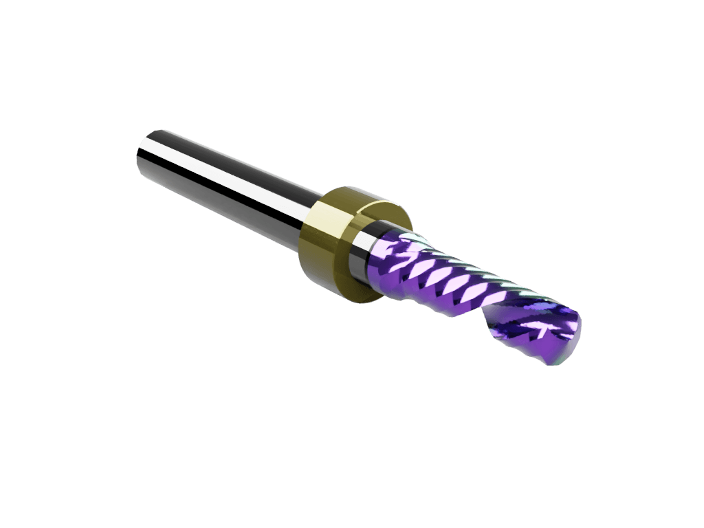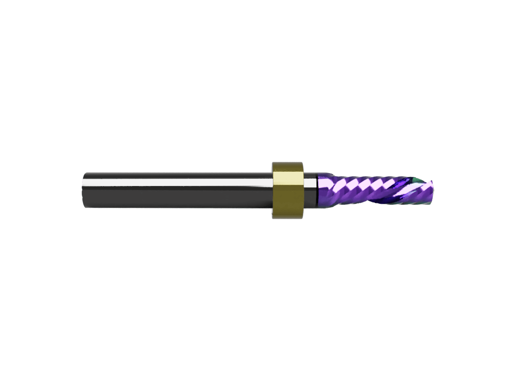 Multielement multilayered “rainbow” coated, “Super” carbide, polished, multi-purpose, single O-flute, left-hand spiral (down cut) router bit with a 5mm cutting edge diameter and max milling depth of 16mm. With stop ring (for use with the Zund ARC system and IECHO Tool Changer).